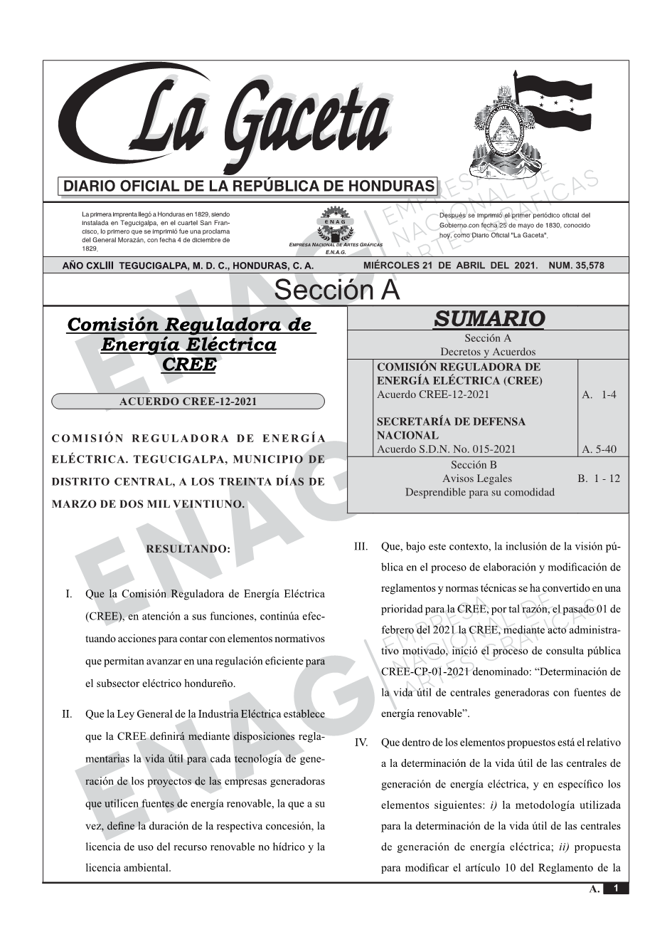 COMISIÓN REGULADORA DE ENERGÍA ELÉCTRICA (CREE)Acuerdo CREE-12-2021