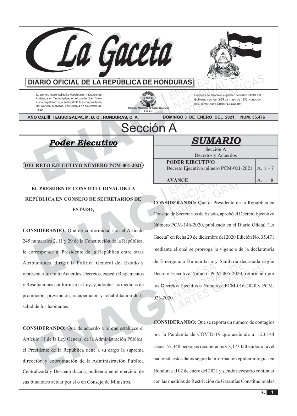 Decreto Ejecutivo número PCM-001-2021