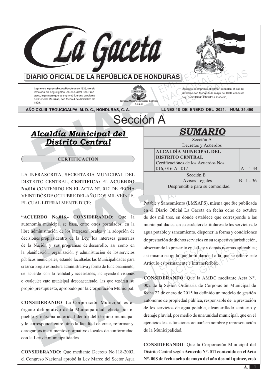 La Gaceta N° 35,490 del 18 de enero de 2021