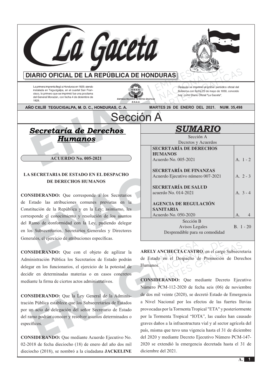 SECRETARÍA DE DERECHOS HUMANOSAcuerdo No. 005-2021