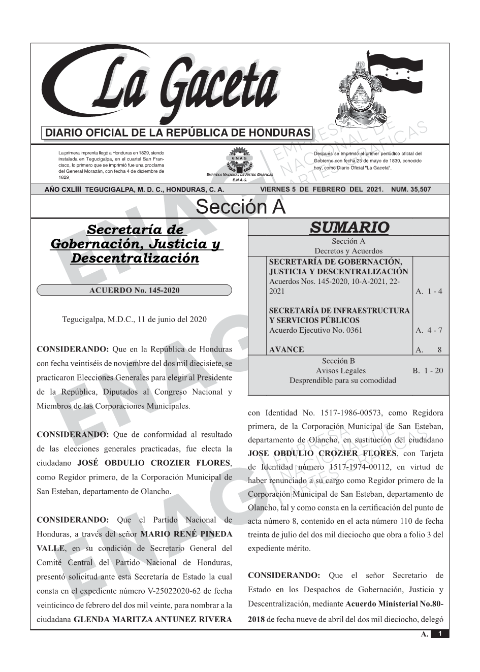 SECRETARÍA DE GOBERNACIÓN, JUSTICIA Y DESCENTRALIZACIÓNAcuerdos Nos. 145-2020, 10-A-2021, 222021