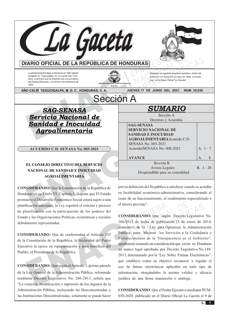 Acuerdo C.D. SENASA No. 003-2021, Acuerdo/SENASA No. 008-2021