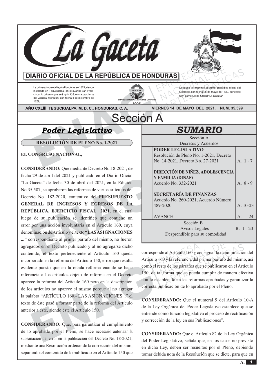 PODER LEGISLATIVOResolución de Pleno No. 1-2021, Decreto No. 14-2021, Decreto No. 27-2021