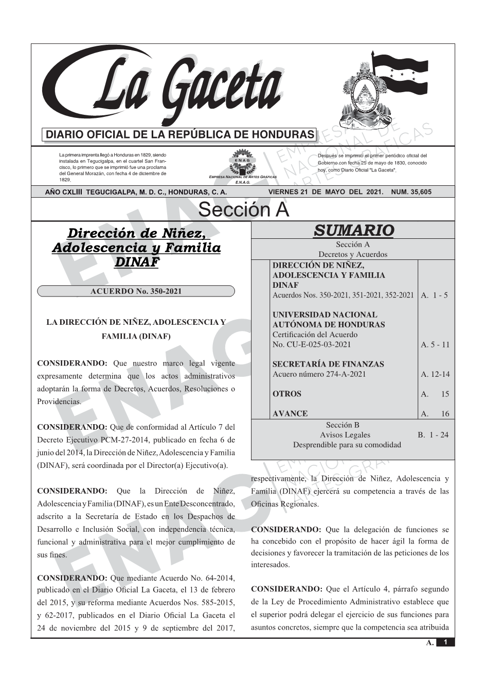 DIRECCIÓN DE NIÑEZ, ADOLESCENCIA Y FAMILIA DINAFAcuerdos Nos. 350-2021, 351-2021, 352-2021