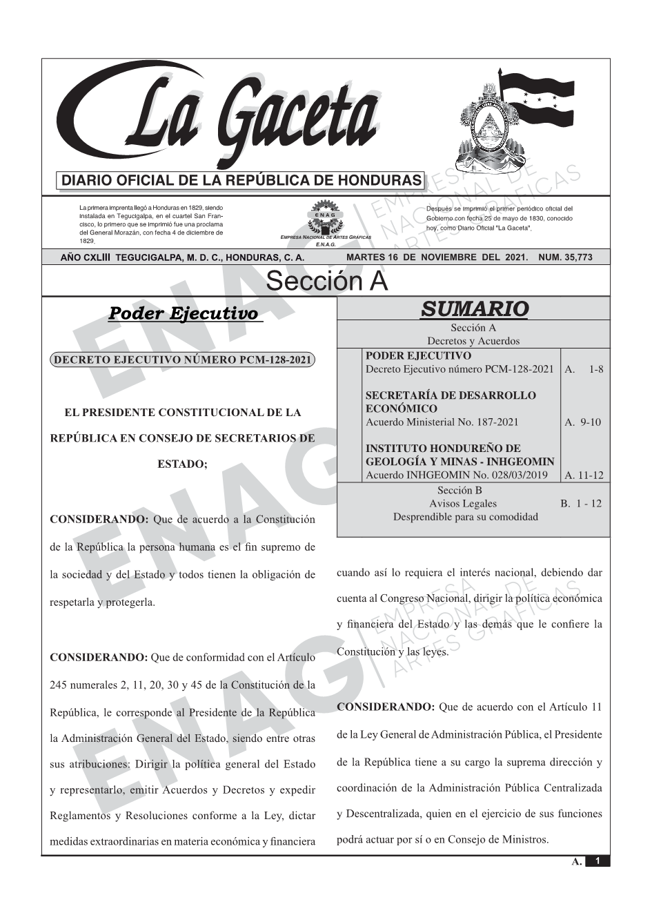 PODER EJECUTIVODecreto Ejecutivo número PCM-128-2021