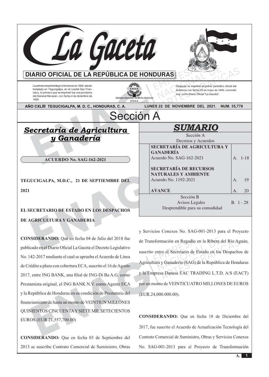 SECRETARÍA DE AGRICULTURA Y GANADERÍAAcuerdo No. SAG-162-2021