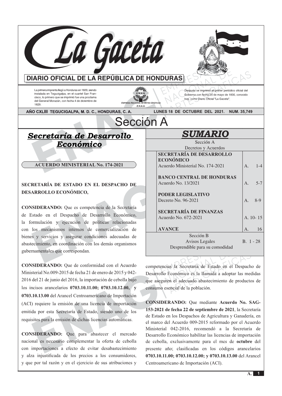 SECRETARÍA DE DESARROLLO ECONÓMICOAcuerdo Ministerial No. 174-2021