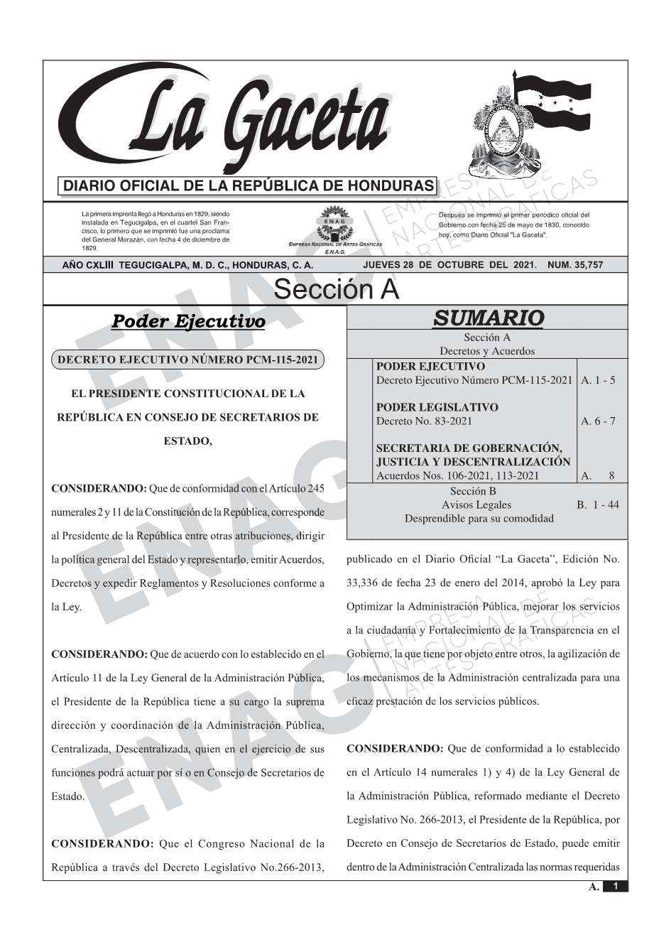 PODER EJECUTIVODecreto Ejecutivo Número PCM-115-2021