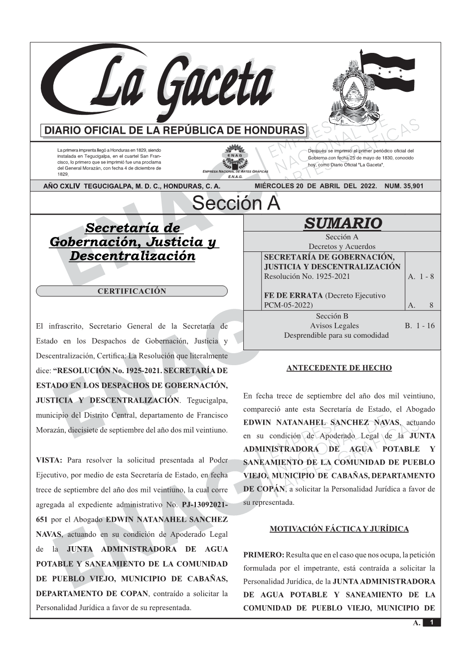 SECRETARÍA DE GOBERNACIÓN, JUSTICIA Y DESCENTRALIZACIÓNResolución No. 1925-2021
