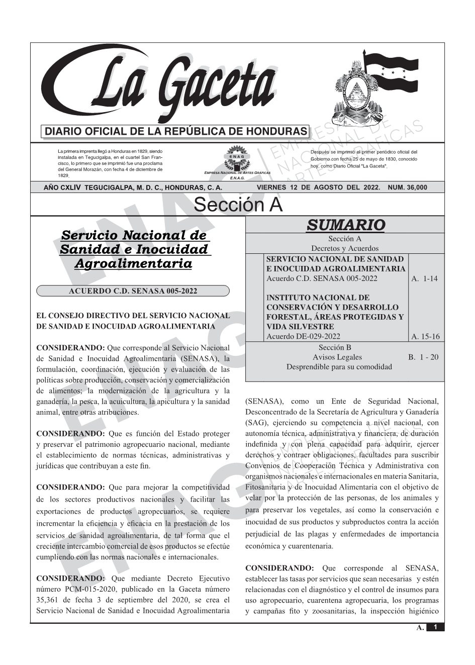 SERVICIO NACIONAL DE SANIDAD E INOCUIDAD AGROALIMENTARIAAcuerdo C.D. SENASA 005-2022
