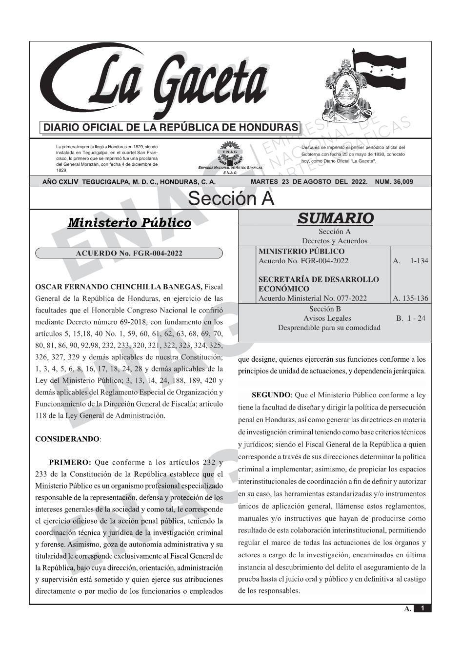 MINISTERIO PÚBLICOAcuerdo No. FGR-004-2022