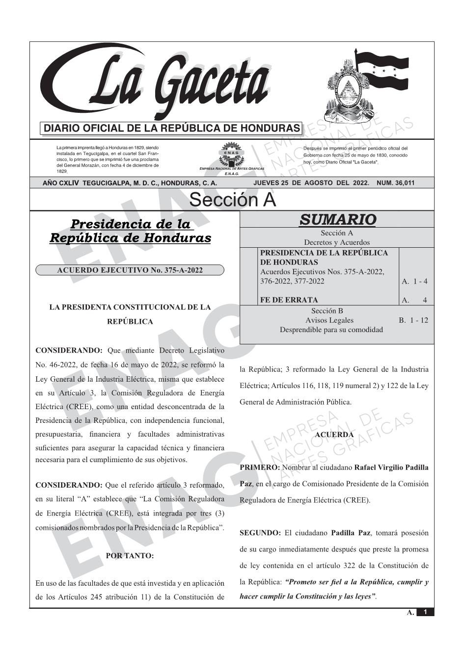 La Gaceta N° 36,011 del 25 de agosto de 2022