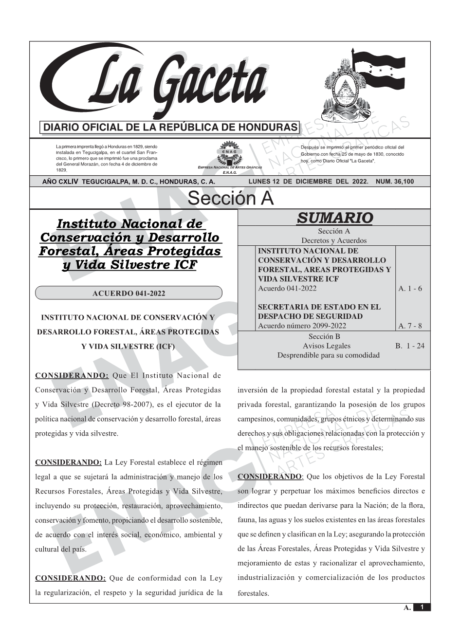 INSTITUTO NACIONAL DE CONSERVACIÓN Y DESARROLLO FORESTAL, AREAS PROTEGIDAS Y VIDA SILVESTRE ICFAcuerdo 041-2022