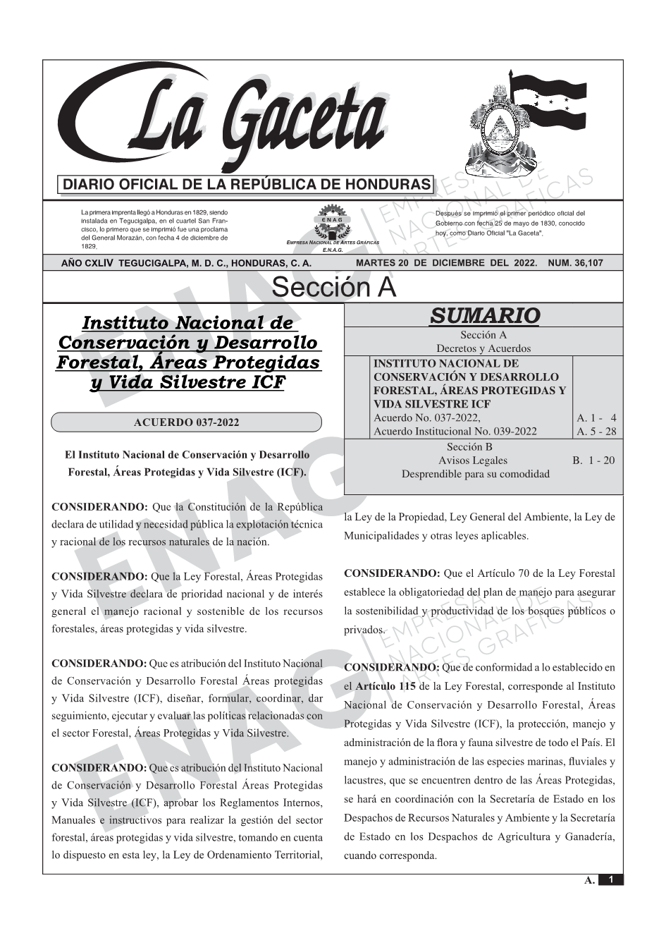 INSTITUTO NACIONAL DE CONSERVACIÓN Y DESARROLLO FORESTAL, ÁREAS PROTEGIDAS Y VIDA SILVESTRE ICFAcuerdo No. 037-2022,Acuerdo Institucional No. 039-2022