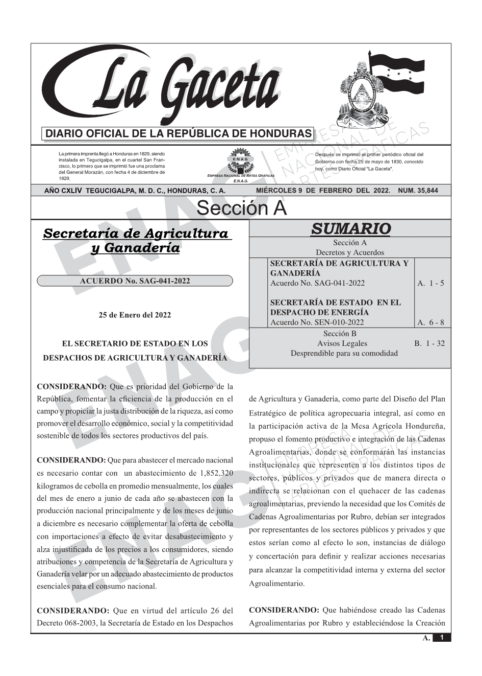 SECRETARÍA DE AGRICULTURA Y GANADERÍAAcuerdo No. SAG-041-2022