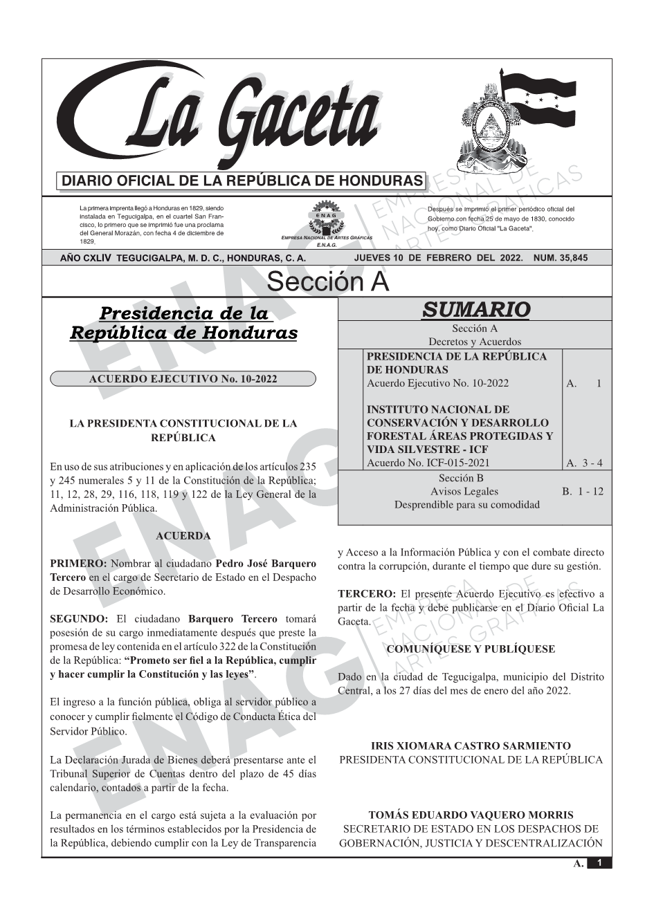 PRESIDENCIA DE LA REPÚBLICA DE HONDURASAcuerdo Ejecutivo No. 10-2022