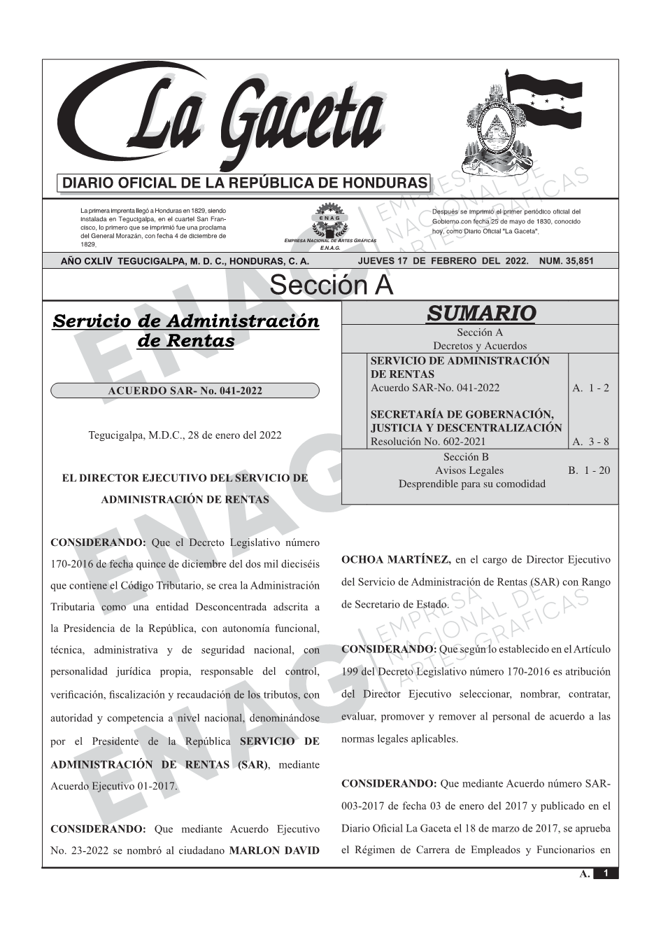 SERVICIO DE ADMINISTRACIÓN DE RENTASAcuerdo SAR-No. 041-2022