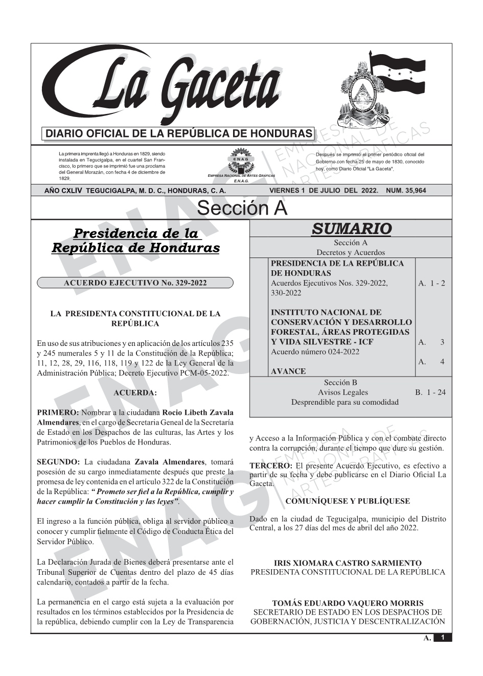 PRESIDENCIA DE LA REPÚBLICA DE HONDURASAcuerdos Ejecutivos Nos. 329-2022, 330-2022