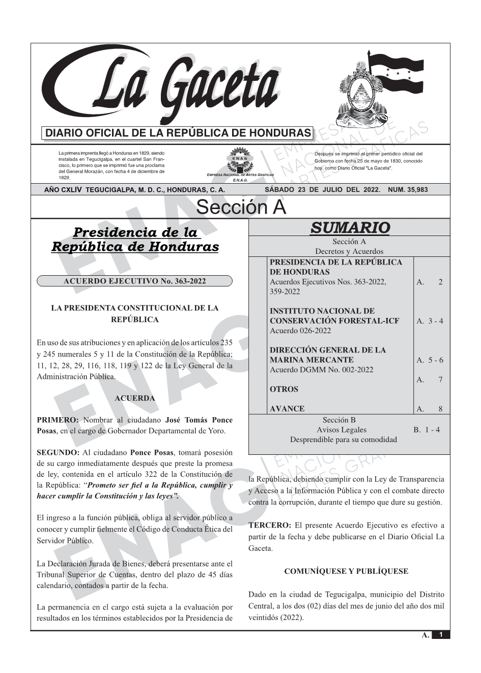 PRESIDENCIA DE LA REPÚBLICA DE HONDURASAcuerdos Ejecutivos Nos. 363-2022, 359-2022