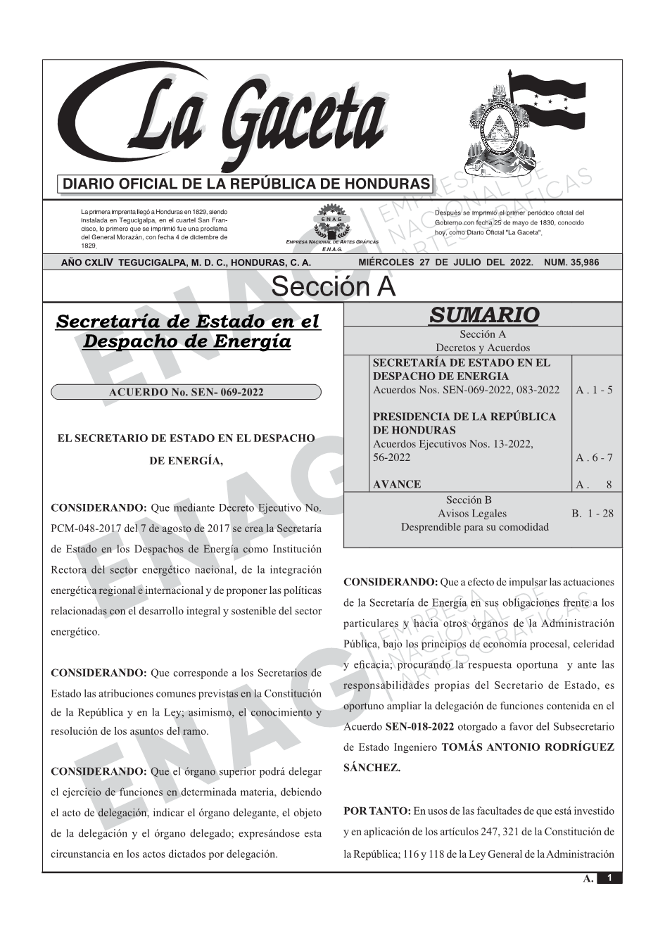 SECRETARÍA DE ESTADO EN EL DESPACHO DE ENERGIAAcuerdos Nos. SEN-069-2022, 083-2022