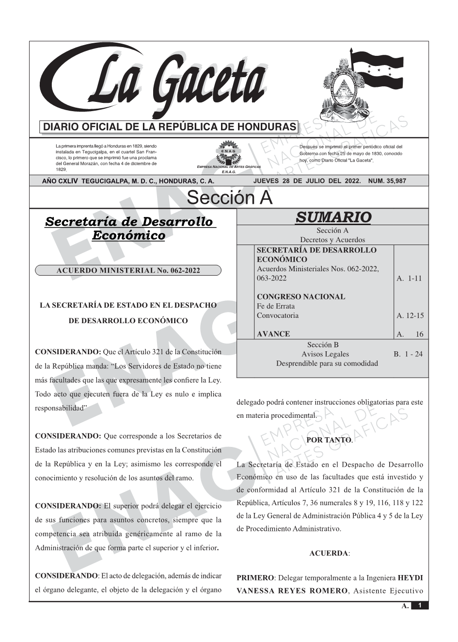 SECRETARÍA DE DESARROLLO ECONÓMICOAcuerdos Ministeriales Nos. 062-2022, 063-2022