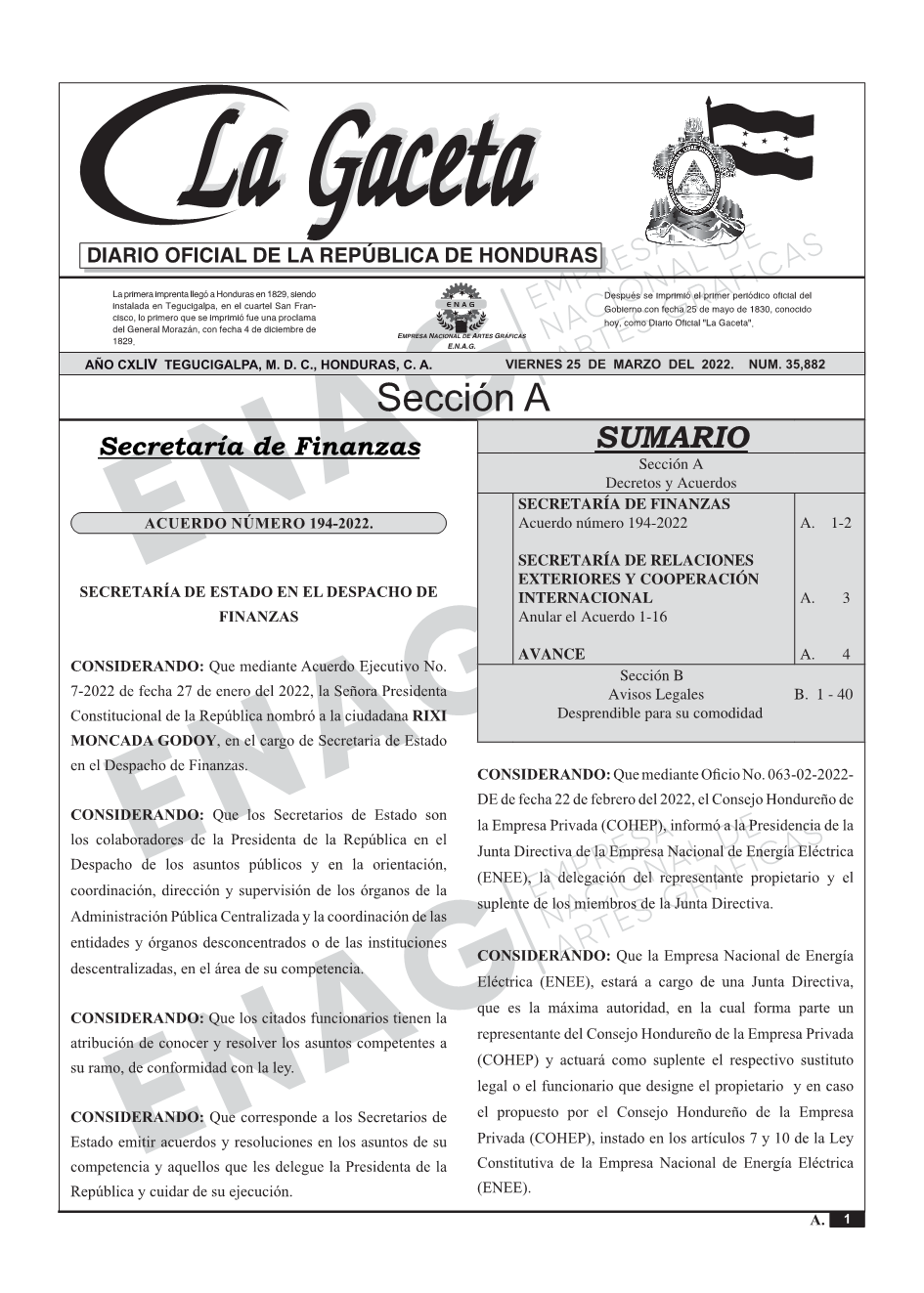 SECRETARÍA DE FINANZASAcuerdo número 194-2022
