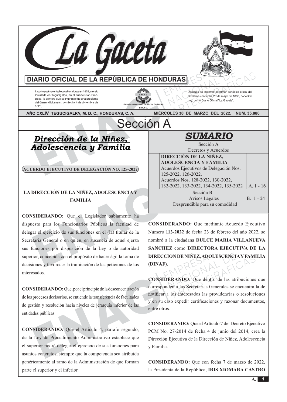 DIRECCIÓN DE LA NIÑEZ, ADOLESCENCIA Y FAMILIAAcuerdos Ejecutivos de Delegación Nos.125-2022, 126-2022,Acuerdos Nos. 128-2022, 130-2022, 132-2022, 133-2022, 134-2022, 135-2022