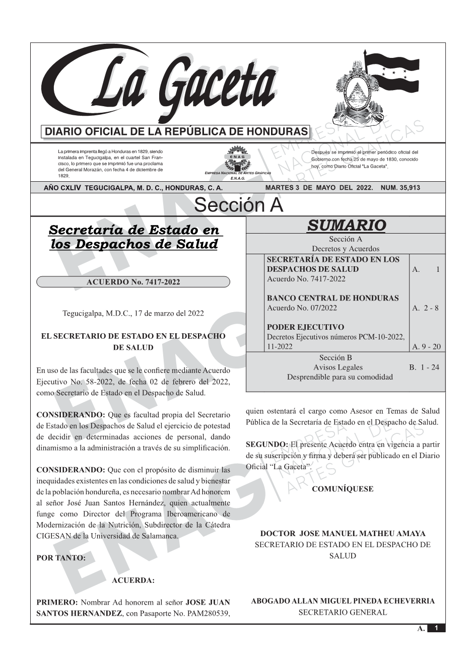 SECRETARÍA DE ESTADO EN LOS DESPACHOS DE SALUDAcuerdo No. 7417-2022