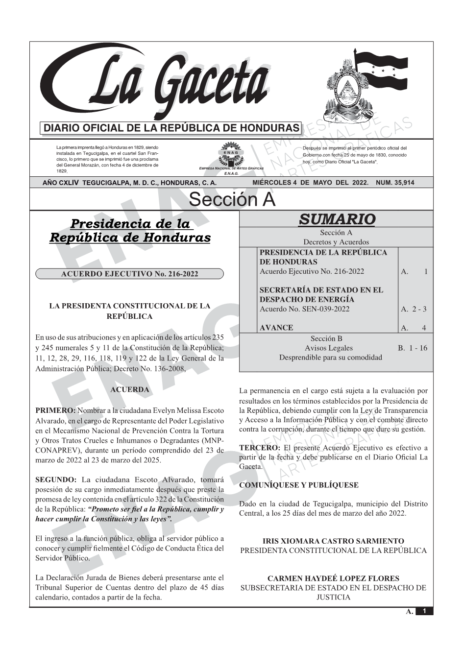 PRESIDENCIA DE LA REPÚBLICA DE HONDURASAcuerdo Ejecutivo No. 216-2022