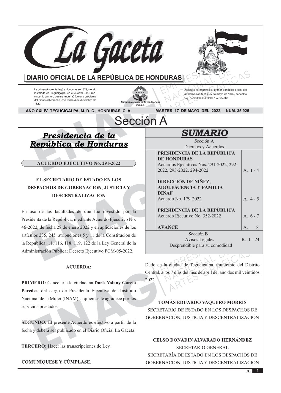 PRESIDENCIA DE LA REPÚBLICA DE HONDURASAcuerdos Ejecutivos Nos. 291-2022, 2922022, 293-2022, 294-2022