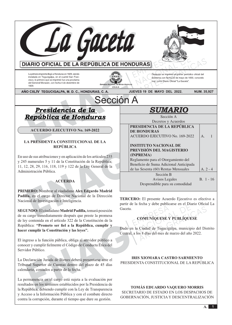 PRESIDENCIA DE LA REPÚBLICA DE HONDURASACUERDO EJECUTIVO No. 169-2022