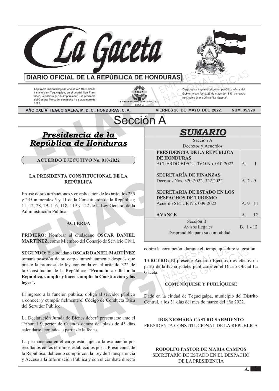 PRESIDENCIA DE LA REPÚBLICA DE HONDURASACUERDO EJECUTIVO No. 010-2022