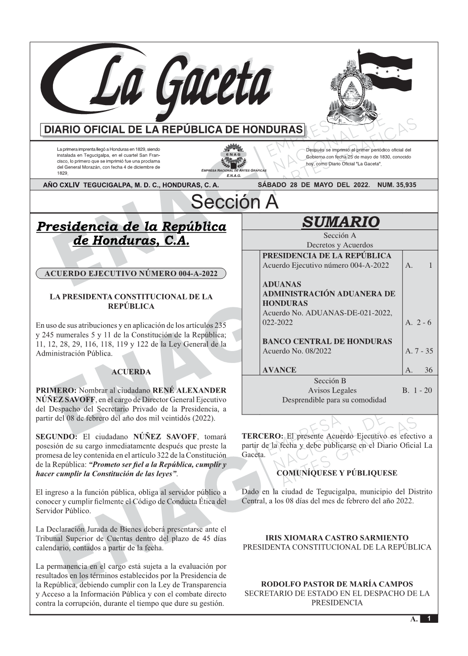 ADUANAS ADMINISTRACIÓN ADUANERA DE HONDURASAcuerdo No. ADUANAS-DE-021-2022, 022-2022