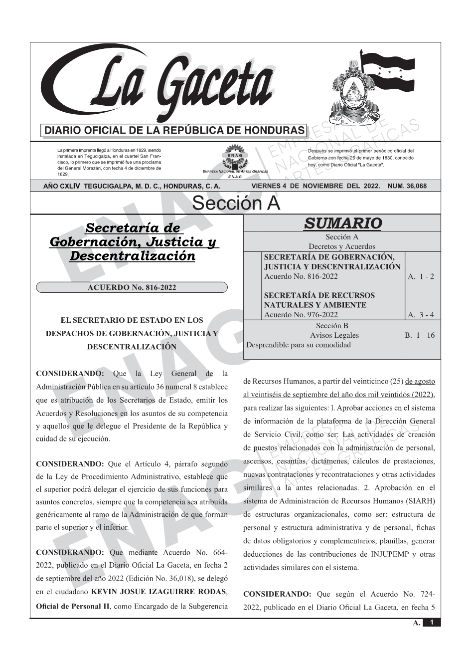 SECRETARÍA DE GOBERNACIÓN, JUSTICIA Y DESCENTRALIZACIÓNAcuerdo No. 816-2022