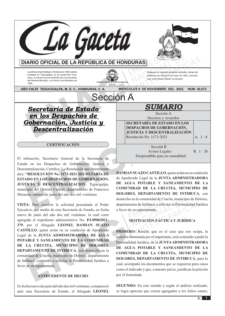 SECRETARÍA DE ESTADO EN LOS DESPACHOS DE GOBERNACIÓN, JUSTICIA Y DESCENTRALIZACIÓNResolución No. 1173-2021
