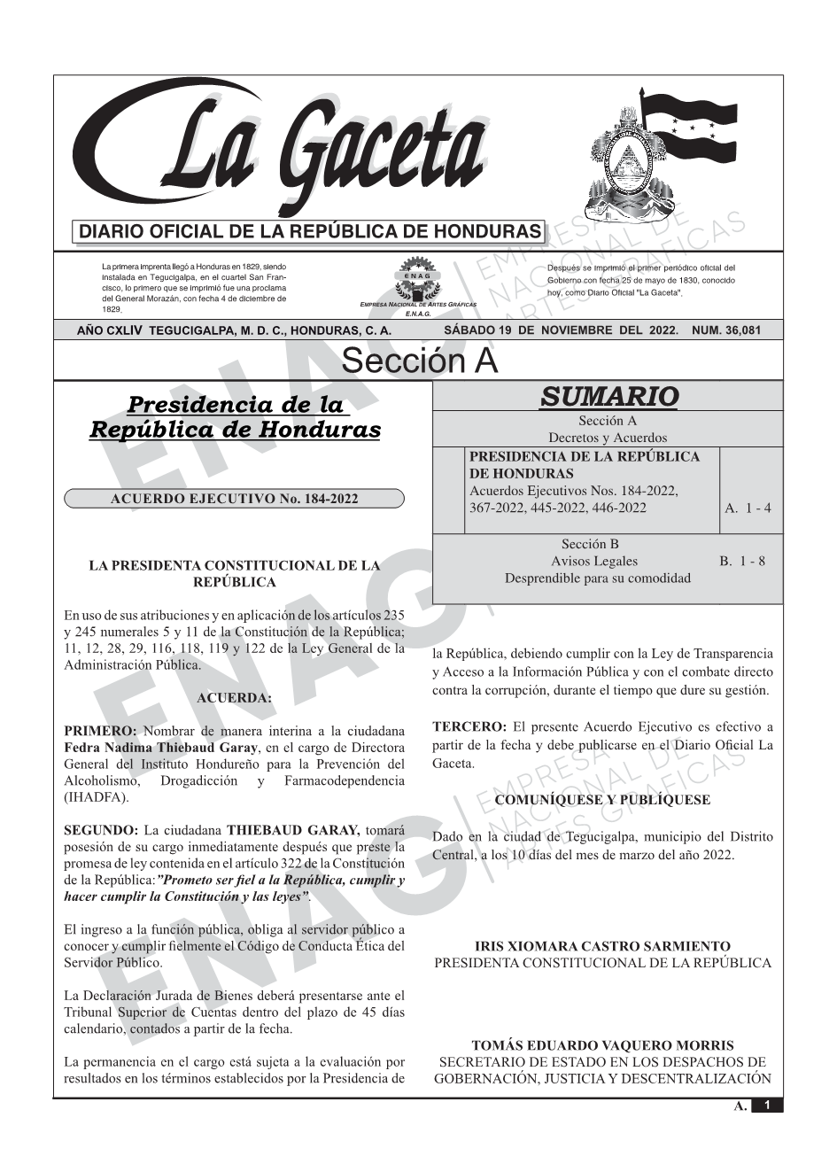 PRESIDENCIA DE LA REPÚBLICA DE HONDURASAcuerdos Ejecutivos Nos. 184-2022, 367-2022, 445-2022, 446-2022