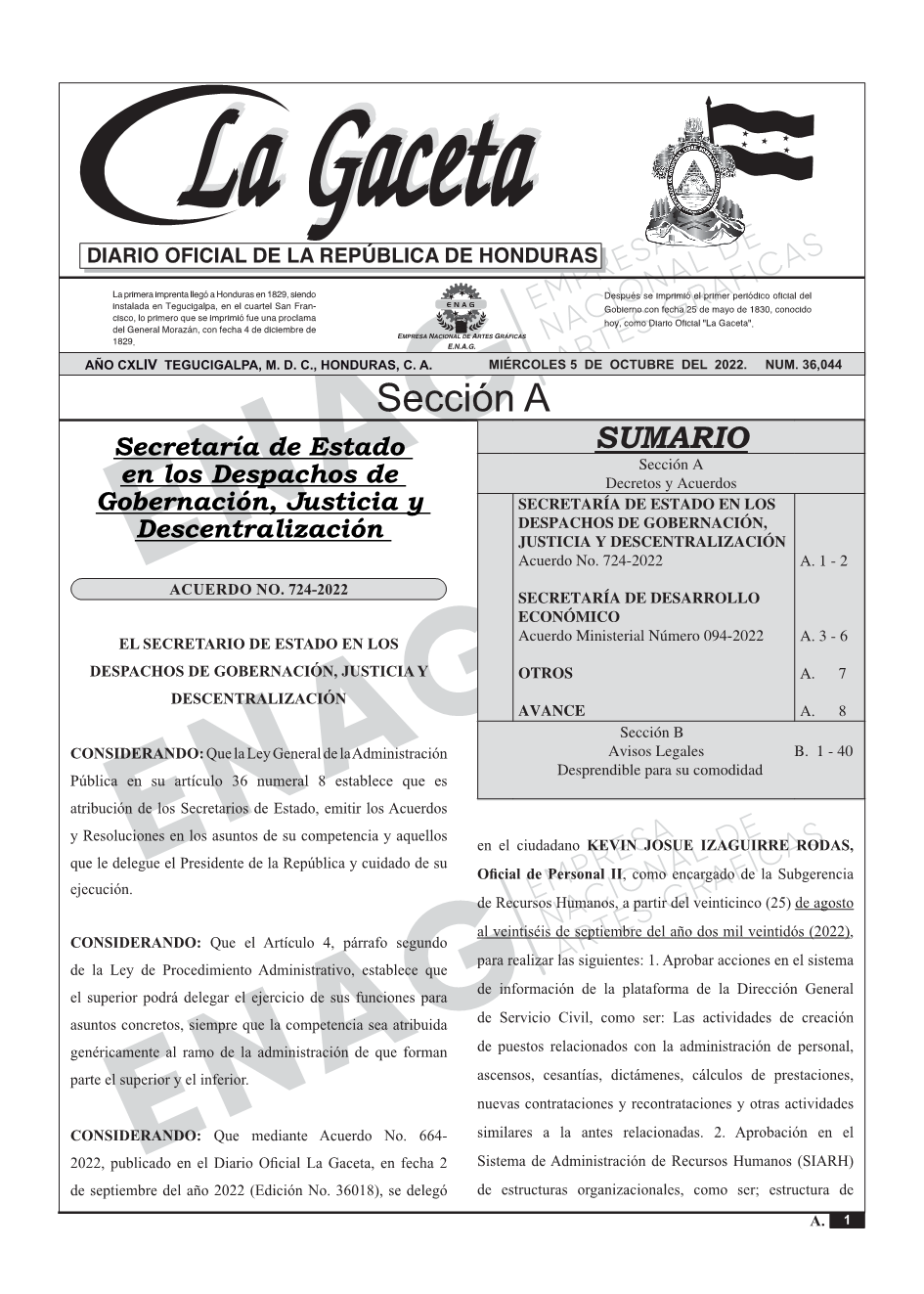 SECRETARÍA DE ESTADO EN LOS DESPACHOS DE GOBERNACIÓN,JUSTICIA Y DESCENTRALIZACIÓNAcuerdo No. 724-2022