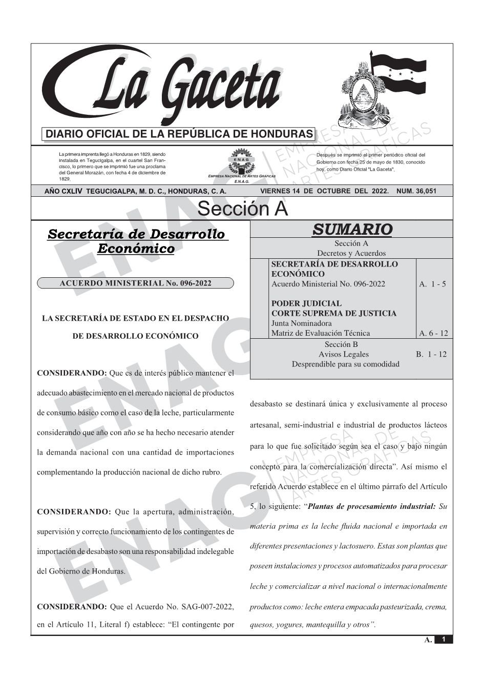 SECRETARÍA DE DESARROLLO ECONÓMICOAcuerdo Ministerial No. 096-2022