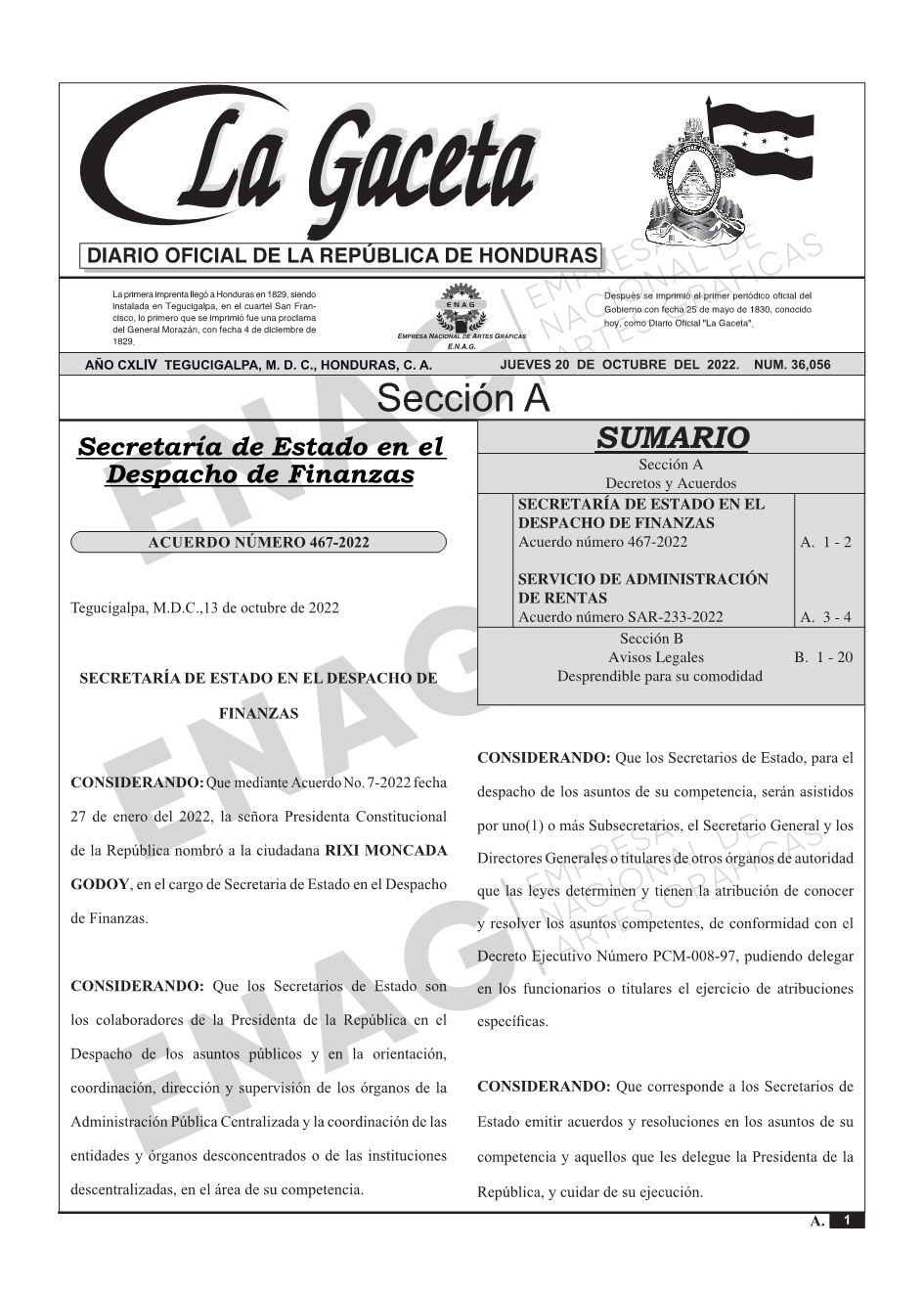 SECRETARÍA DE ESTADO EN EL DESPACHO DE FINANZASAcuerdo número 467-2022