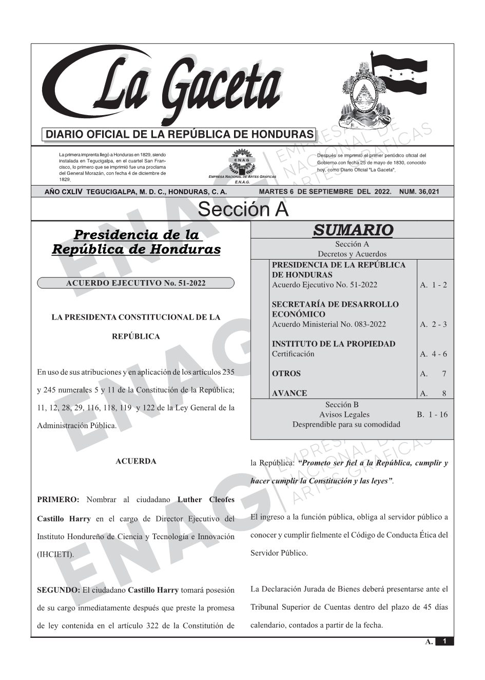 PRESIDENCIA DE LA REPÚBLICA DE HONDURASAcuerdo Ejecutivo No. 51-2022