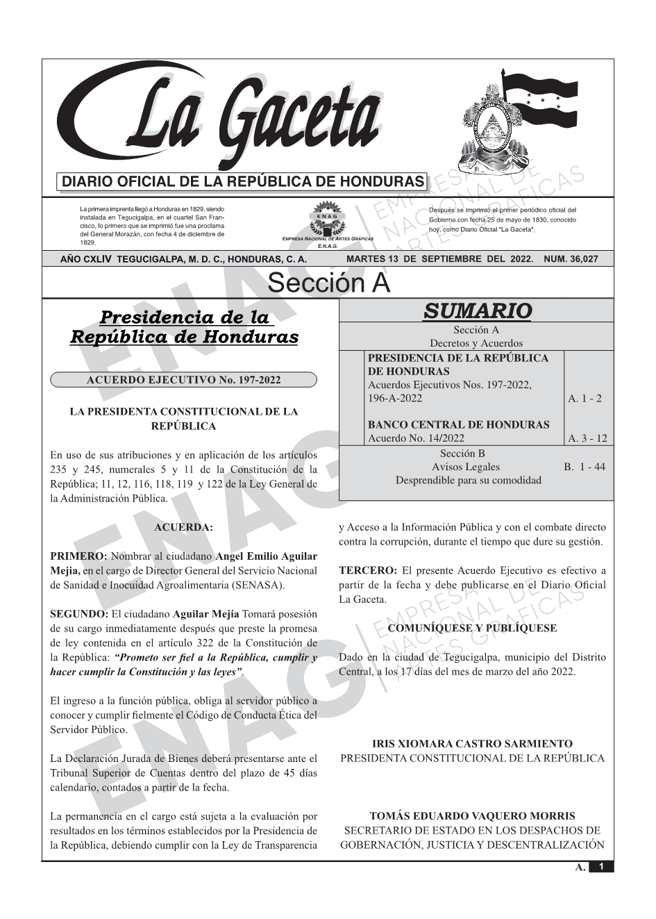 PRESIDENCIA DE LA REPÚBLICA DE HONDURASAcuerdos Ejecutivos Nos. 197-2022, 196-A-2022