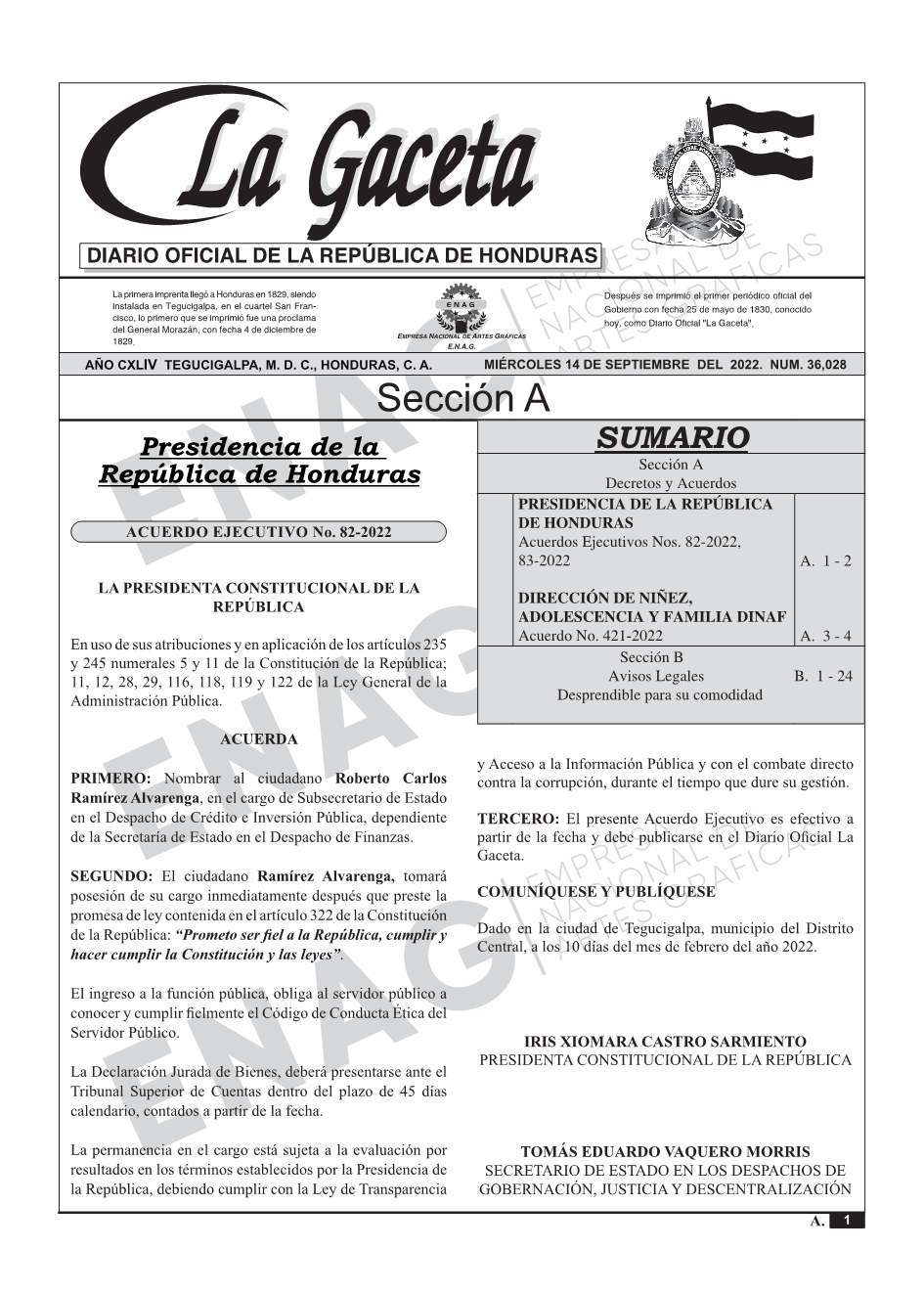 PRESIDENCIA DE LA REPÚBLICA DE HONDURASAcuerdos Ejecutivos Nos. 82-2022, 83-2022