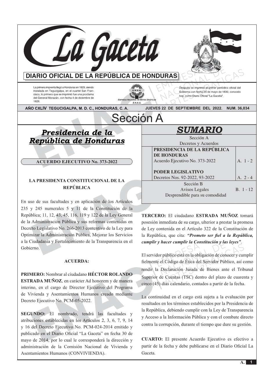 PRESIDENCIA DE LA REPÚBLICA DE HONDURASAcuerdo Ejecutivo No. 373-2022