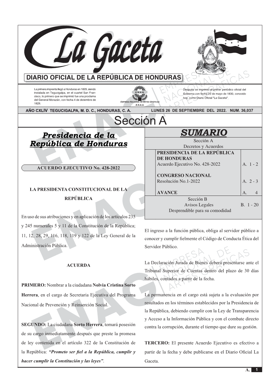 PRESIDENCIA DE LA REPÚBLICA DE HONDURASAcuerdo Ejecutivo No. 428-2022