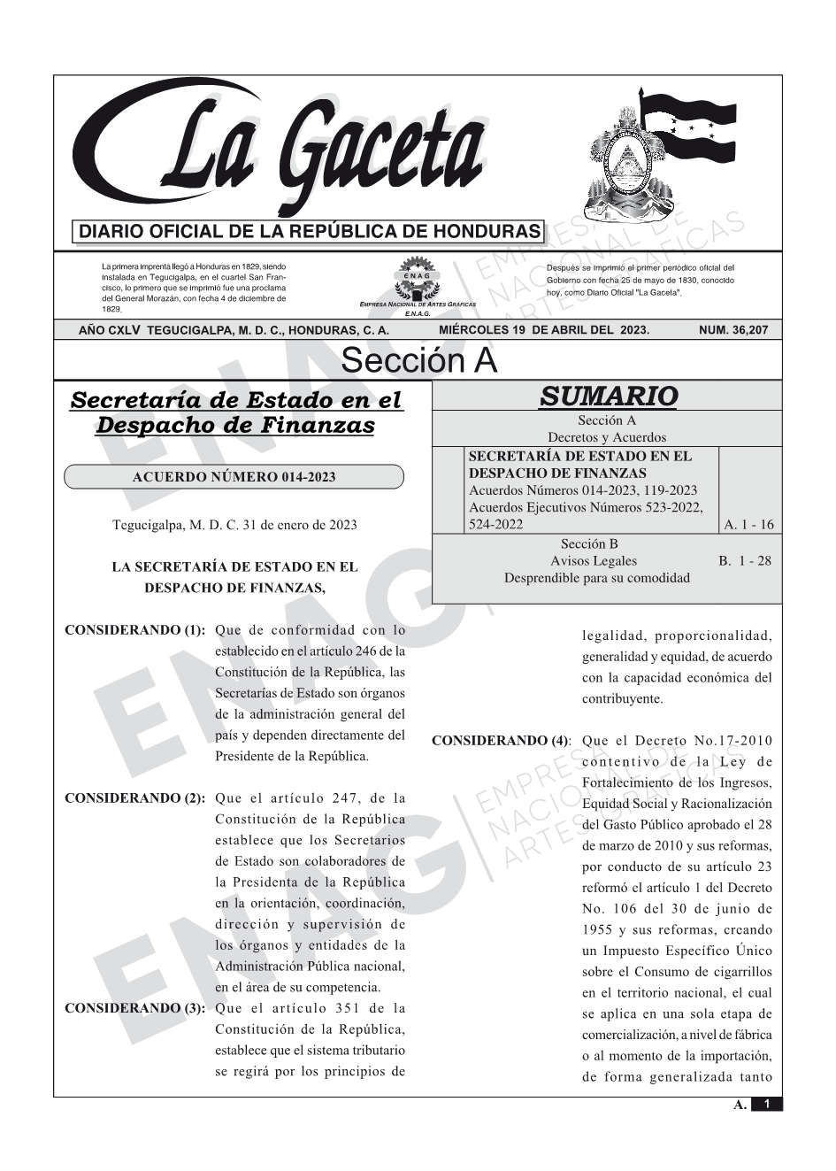 SECRETARÍA DE ESTADO EN EL DESPACHO DE FINANZASAcuerdos Números 014-2023, 119-2023, Acuerdos Ejecutivos Números 523-2022, 524-2022