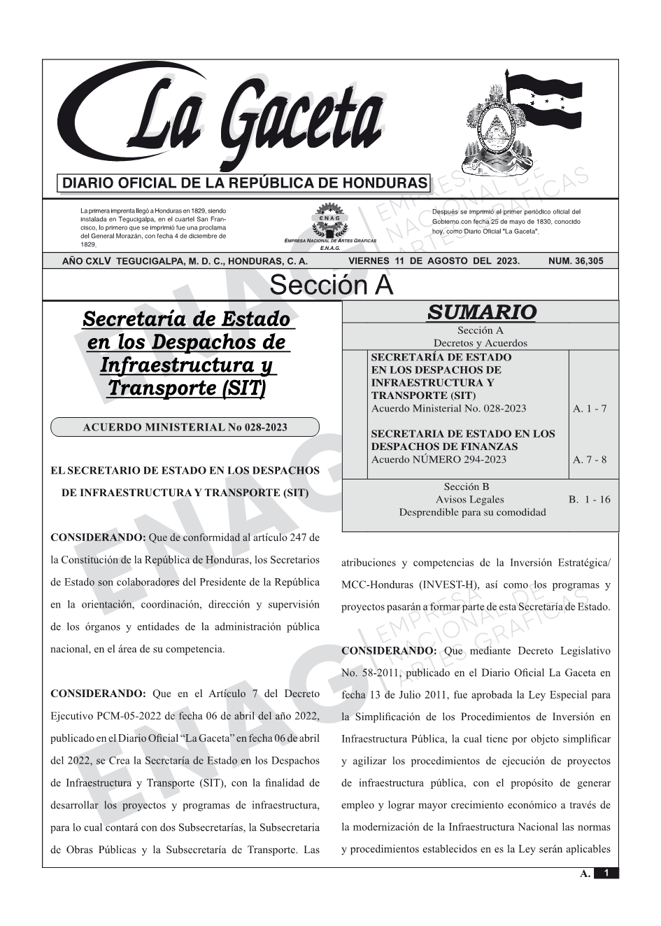 SECRETARÍA DE ESTADO EN LOS DESPACHOS DE INFRAESTRUCTURA Y TRANSPORTE (SIT)Acuerdo Ministerial No. 028-2023