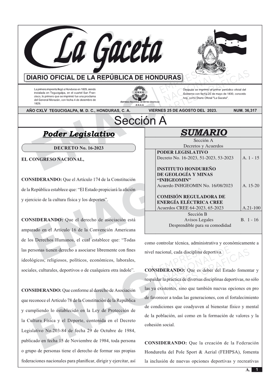 INSTITUTO HONDUREÑO DE GEOLOGÍA Y MINAS “INHGEOMIN”Acuerdo INHGEOMIN No. 16/08/2023