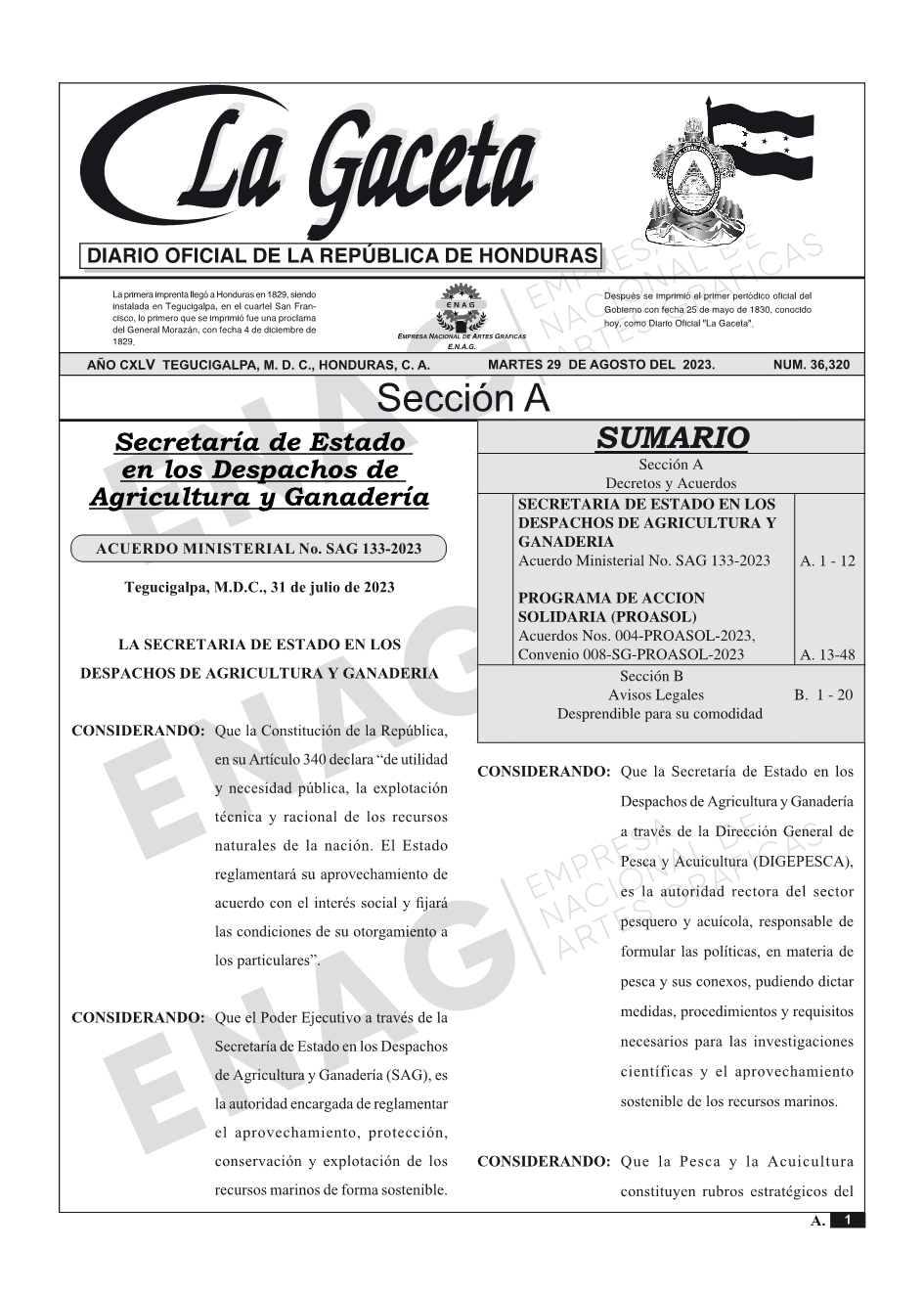 SECRETARIA DE ESTADO EN LOS DESPACHOS DE AGRICULTURA Y GANADERIAAcuerdo Ministerial No. SAG 133-2023