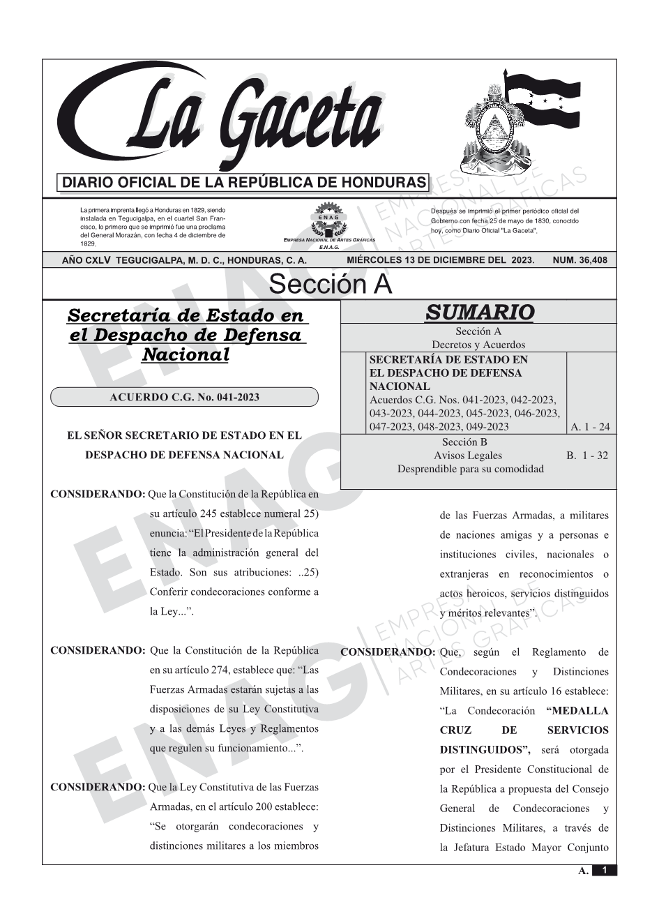 SECRETARÍA DE ESTADO EN EL DESPACHO DE DEFENSA NACIONALAcuerdos C.G. Nos. 041-2023, 042-2023, 043-2023, 044-2023, 045-2023, 046-2023, 047-2023, 048-2023, 049-2023