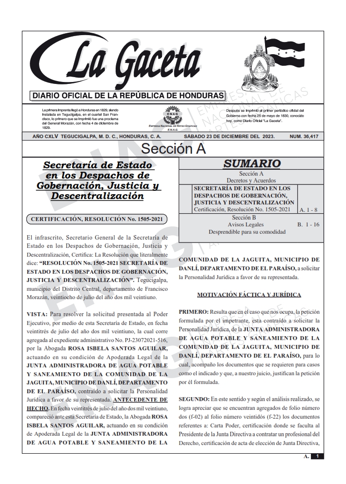 SECRETARÍA DE ESTADO EN LOS DESPACHOS DE GOBERNACIÓN, JUSTICIA Y DESCENTRALIZACIÓNCertificación, Resolución No. 1505-2021